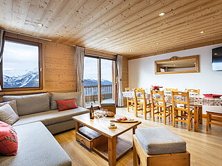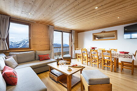 Lounge-Wohnbereich mit gemütlichen Sitzecken mit Balkon und Flachbildschirm. Der Essbereich ebenfalls mit Balkon und herrlichem Blick auf Viertausender-Berge.